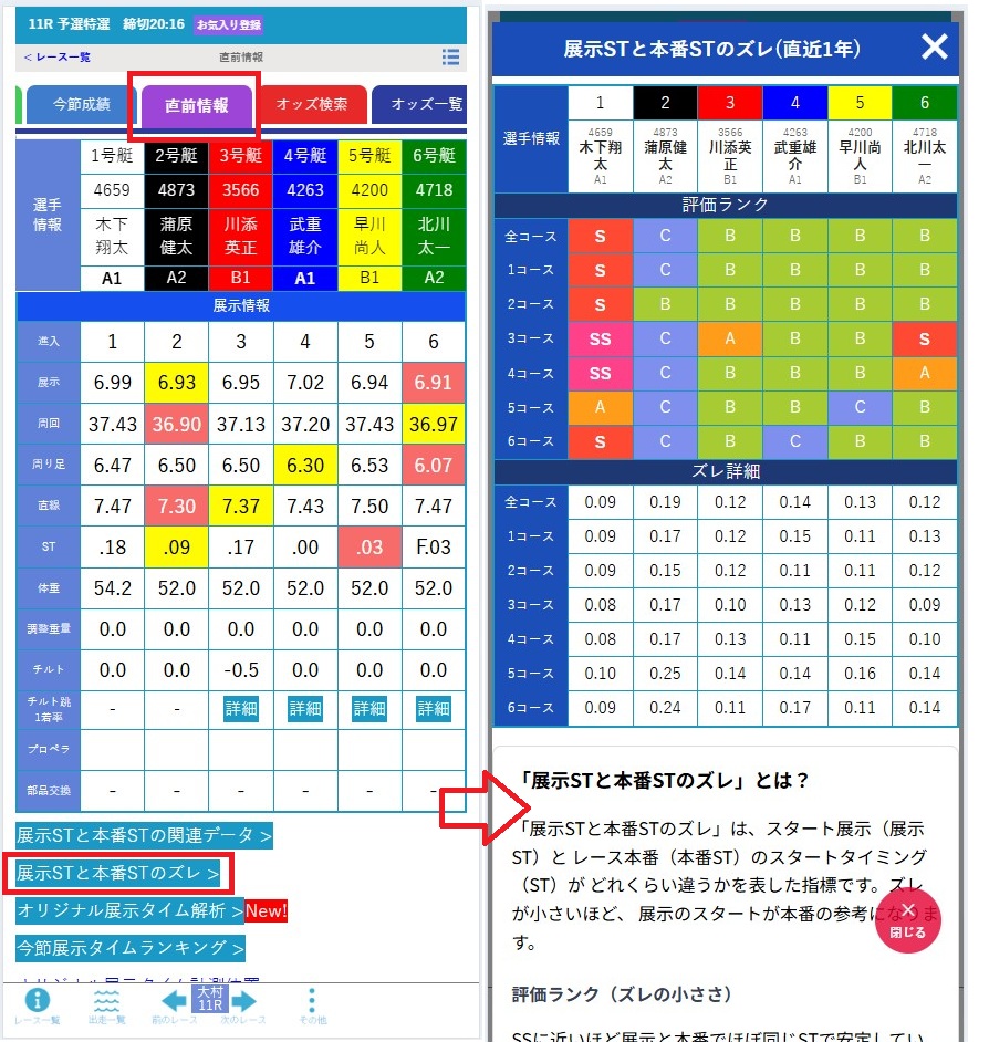 スタート展示(展示ST)と レース本番(本番ST)のスタートタイミング(ST)が どれくらい違うかを表した指標「展示STと本番STのズレ」を追加。